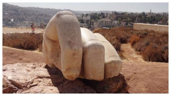 Tangan raksasa ini berada di puncak bukit yang terletak di Benteng Amman, Yordania.