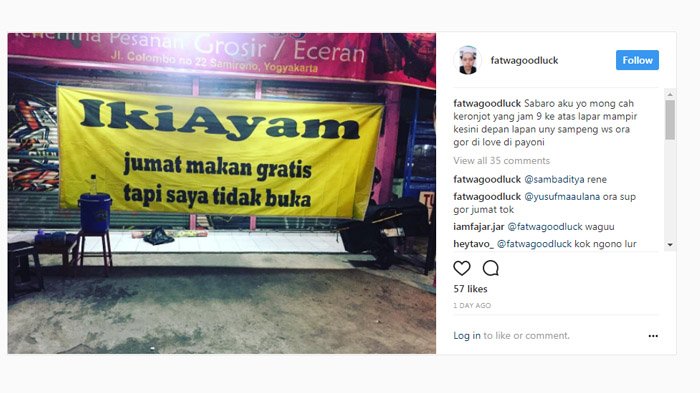 "Sabaro aku yo mong cah keronjot yang jam 9 ke atas lapar mampir kesini depan lapan uny sampeng ws ora gor di love di payoni," tulis @fatwagoodluck.