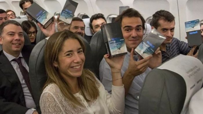 Hingga muncul pramugari yang membawa tumpukan Galaxy Note 8 untuk dibagikan.