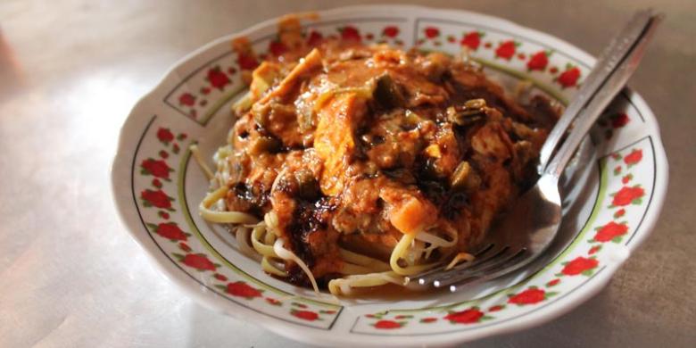 Dalam seporsi toge goreng berisi potongan lontong, tahu, dan mi kuning, yang disiram dengan kuah gurih yang terbuat dari oncom.