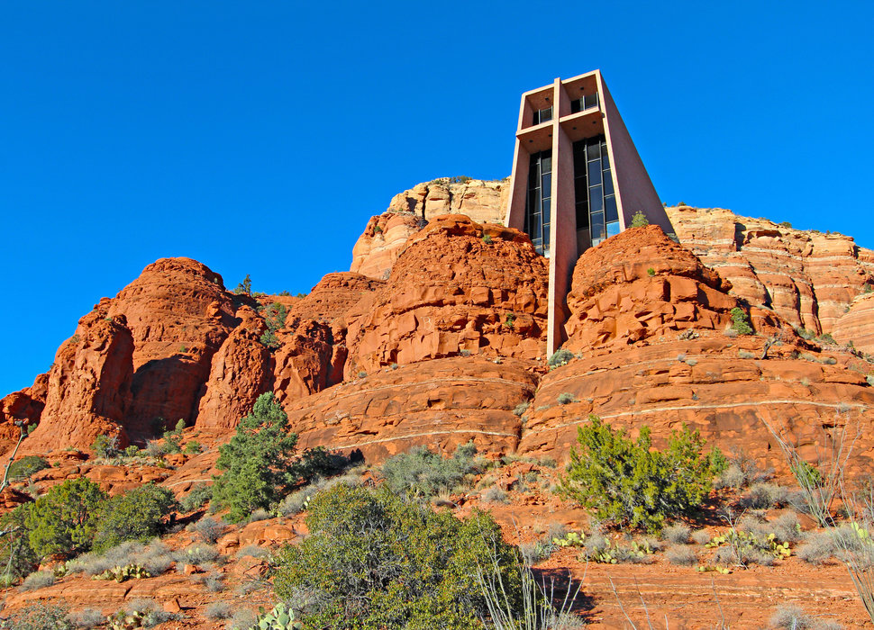 Selesai dibangun tahun 1956, gereja ini tampak menjulang dari sela-sela bebatuan merah Arizona seperti sebuah periskop.