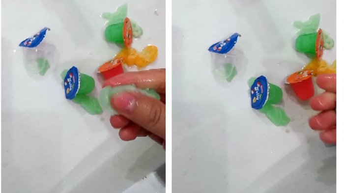 Dalam video tersebut, ia dan temannya mencoba menghancurkan jelly dengan memencet-mencetnya lalu mencucinya di wastafel.