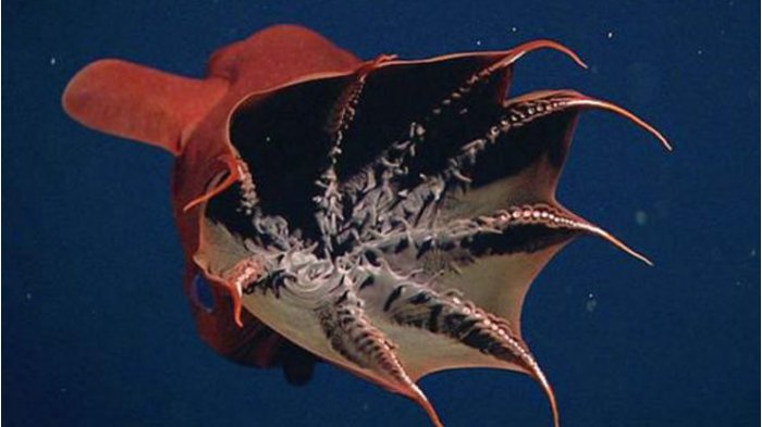 Lengan cumi-cumi vampir ini berjumlah delapan yang dilapisi oleh duri dan cangkir hisap.