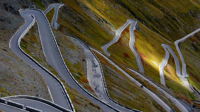 Stelvio Pass terletak di Italia dan dibangun pada ketinggia 9045 kaki.
