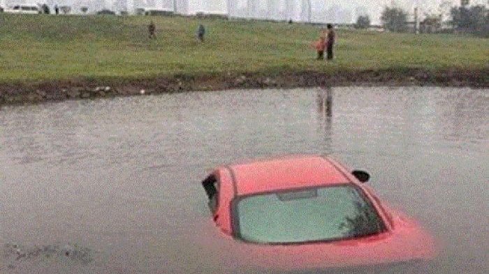 Namun, laju mobil mewahnya yang tidak terkendali justru menuju ke dalam kolam yang berada di seberang jalan.