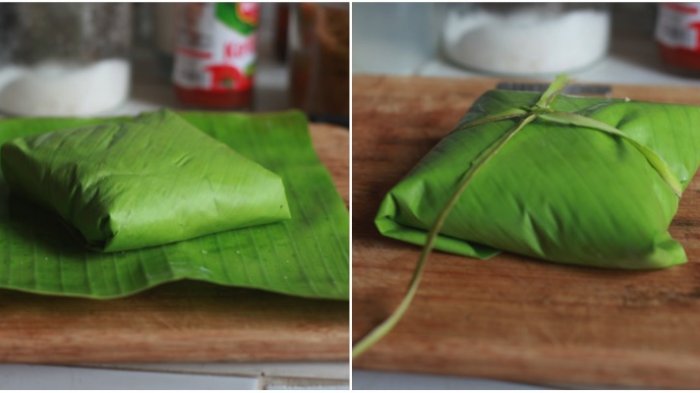 Makanan tersebut jadi jauh lebih sedap karena dibungkus daun pisang.