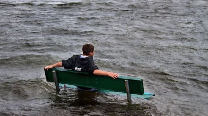 Banjir bandang sedang menerjang, orang ini malah duduk selow di bangku.