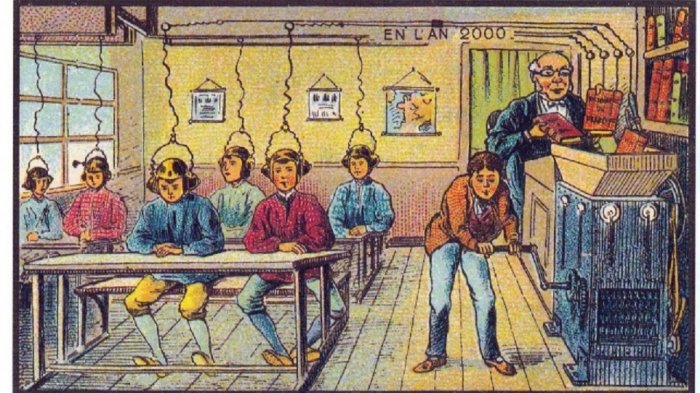 Pada masa itu, dibayangkan ada kereta dan mobil (taksi) terbang.