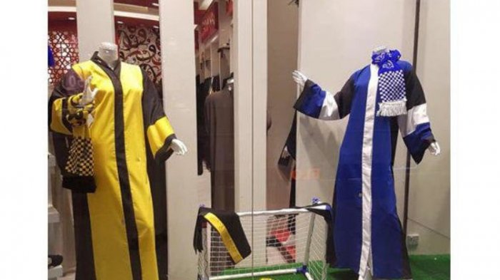 Dalam foto yang dilansir Arab News, ada sebuah toko yang memajang abaya dua tim kuat Saudi Pro League, Al-Ittihad Jeddah dan Al-Hilal Riyadh.