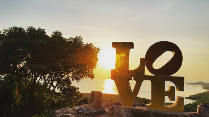 Sebuah batu besar bertulis "Love" terpajang di ujung bukit.