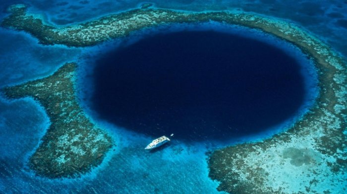 Giant Blue Hole, yang terletak di kawasan negara pesisir timur Amerika Tengah, Belize, ini punya diameter sekitar 300 meter dan dalamnya sekitar 124 meter.