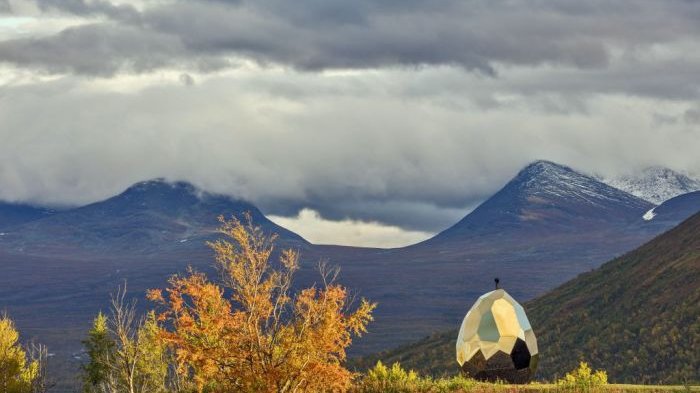 Berdiri setinggi lima meter dan lebarnya empat meter, Telur Solar memiliki cangkang berlapis emas stainless steel yang mencerminkan pantulan kota dan daerah sekitarnya yang indah.