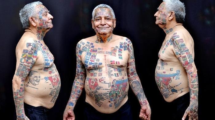 Har Parkash Rishi yang kini berusia 74 tahun mencatatkan diri sebagai pemilik 25 rekor Guinness, satunya memiliki tato 499 bendera negara di tubuhnya.