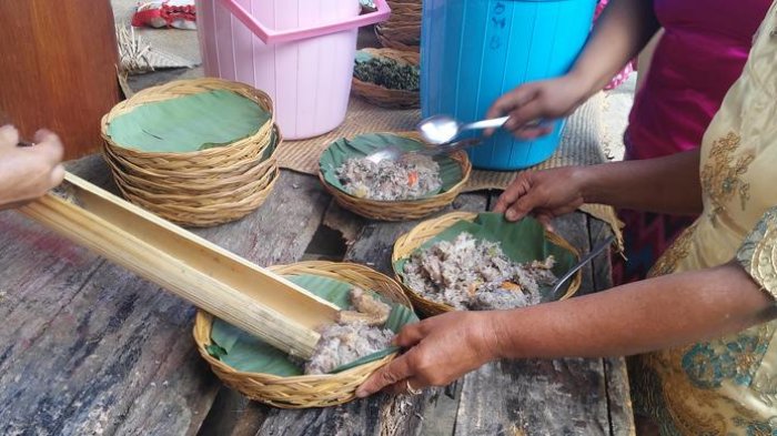 Margareth melanjutkan, batang pohon pisang itu kemudian diolah bersama daging ayam bakar setengah matang dan parutan kelapa.