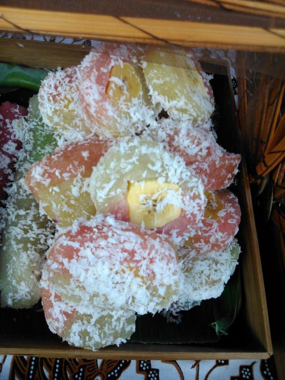 Camilan yang satu ini memiliki bentuk yang berwarna-warni dan biasanya ditaburi kelapa parut.