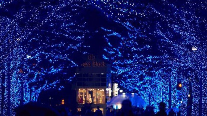 Lampu berwarna biru dipasang di sepanjang jalan taman Shibuya dan deretan pohon Keyaki di taman Yoyogi.