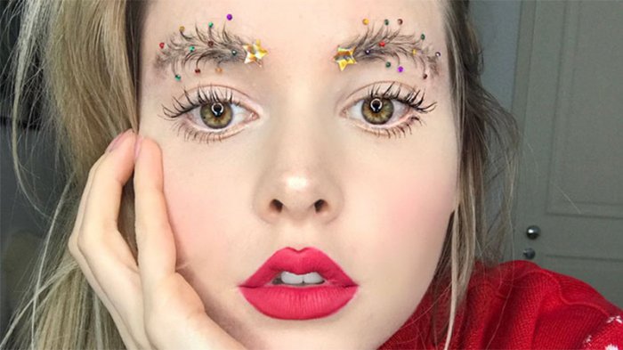 Alisnya diubah menjadi sebuah media untuk menumpahkan kreasi pohon natal berjalan yang menempel di wajah.
