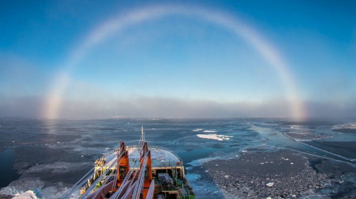 Pelangi putih terjadi saat tetesan air tertangkap kabut dan sinar Matahari mengenainya.