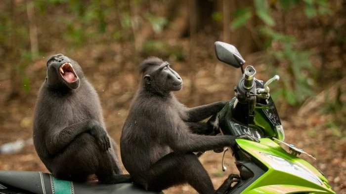 Sangat lucu, foto ini memperlihatkan dua ekor monyet yang sedang duduk di atas sebuah sepeda motor.