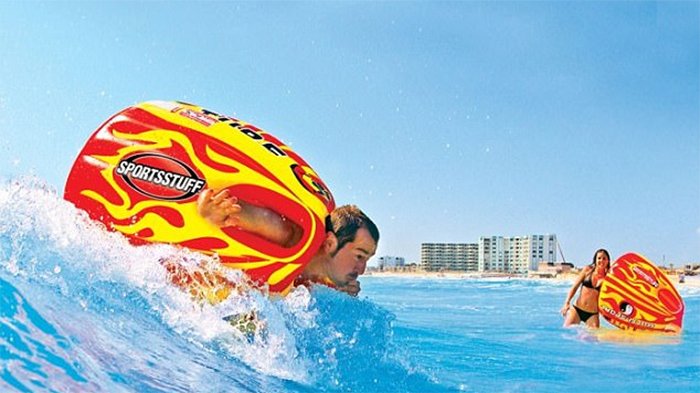 Sumo Tube, semacam kaos tiup yang biasa dipakai para perenang untuk melakukan olahraga laut yang lalu ditarik oleh kapal cepat.