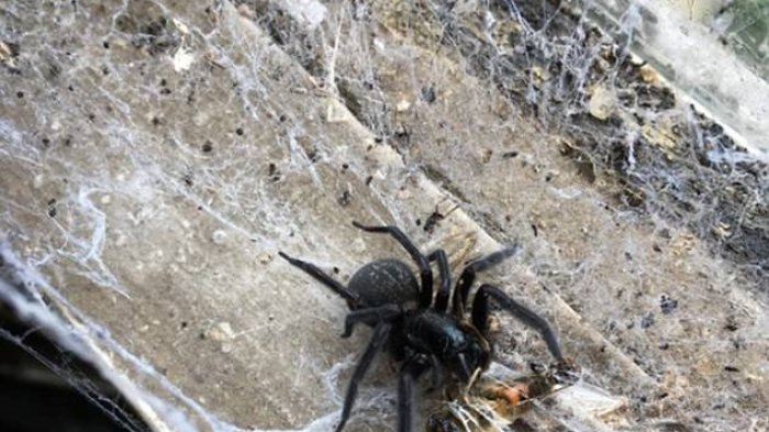 Foto tersebut menunjukkan seekor laba-laba hitam besar tampak berpesta dengan tangkapannya yang terjaring di sarang.