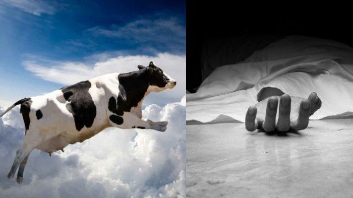 Sampai kemudian tiba-tiba sapi jatuh melalui atap dan menimpanya.