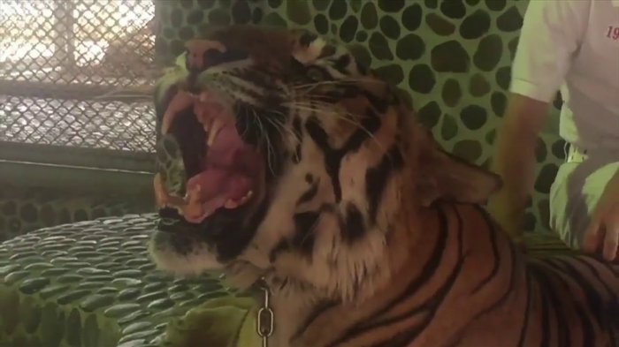 "Harimau ini ditusuk seharian, ratusan kali sehari sehingga dia bisa mengaum untuk dipotret dengan turis," tulis Edwin Wiek, pendiri Wildlife Friends Foundation Thailand, yang merekam video tersebut dan memasangnya di Facebook.