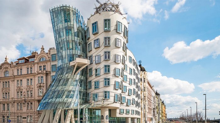 Didesain oleh Frank Gehry, Dancing House atau Rumah yang Menari berlokasi di Praha, Republik Ceko.
