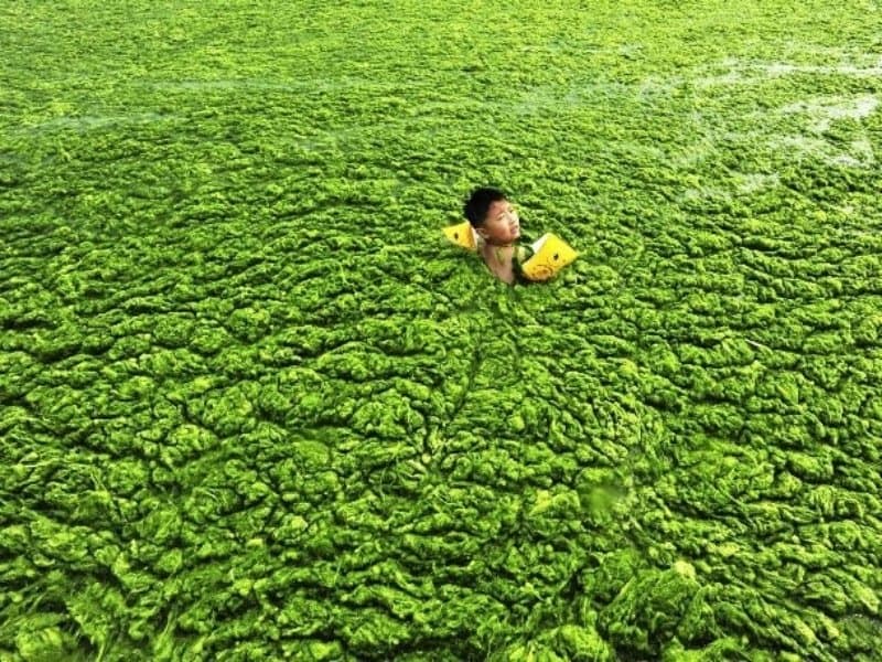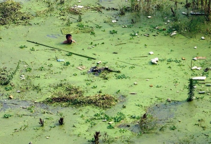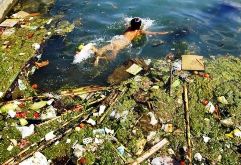 Terlihat seorang anak berenang di laut tercemar yang dipenuhi limbah dan sampah.