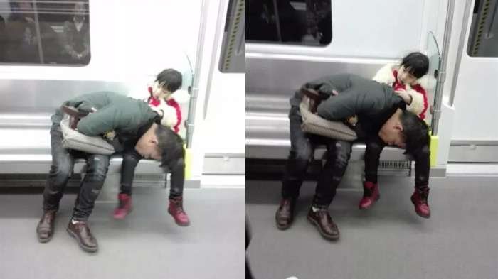 Dalam foto itu terlihat bagaimana seorang gadis cilik memangku kepala ayahnya yang sedang tertidur dalam perjalanan kereta.