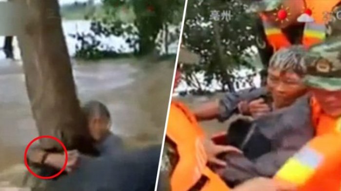 Sebelum tim penyelamat tiba, sang suami berhasil mengikat istrinya yang berusia 70 tahun melekat di pohon dengan pakaiannya, ketika banjir melanda rumah mereka.