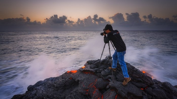 Di foto ini, Tom terlihat begitu dekat dengan aliran lava vulkanik meleleh di bawah sepatu dan tripodnya.