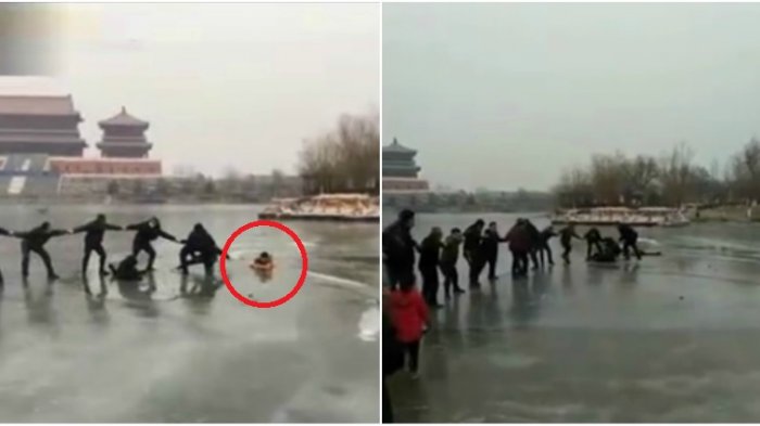 Sayangnya di beberapa langkahnya, mereka menginjang lapisan es yang tipis dan membuatnya terperosok ke dalam.