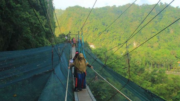 Untuk menaikinya pengunjung diharuskan antre, karena jembatan dengan panjang 50 meter ini memiliki maksimal bobot.