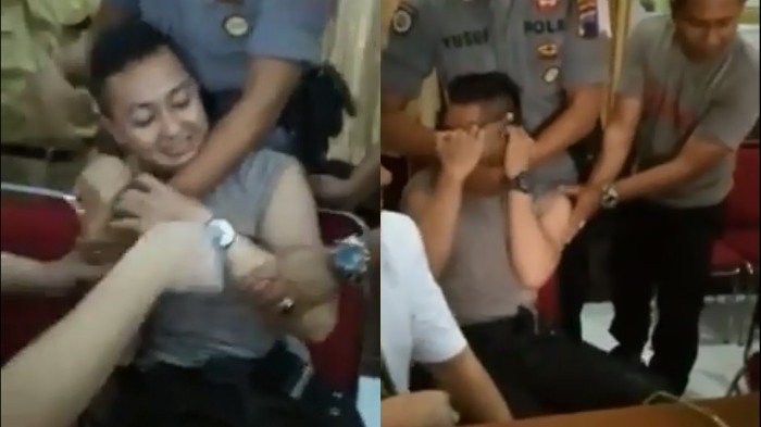 Saking paniknya, tubuh polisi muda itu sampai dipegang dua polisi dan seorang petugas kesehatan.