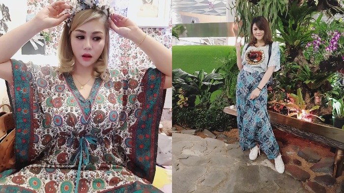 Di obyek wisata tersebut, DJ Katty Butterfly mengenakan daster lengan panjang bercorak batik cokelat.