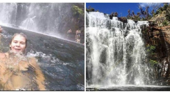 Bading berenang di depan air terjun sedangkan pria yang tenggelam itu berada tepat di bawah air terjun.