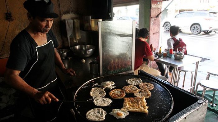 Roti semacam cane disajikan dengan berbagai pilihan lauk seperti telur, daging sapi atau ayam kuah kari yang khas.