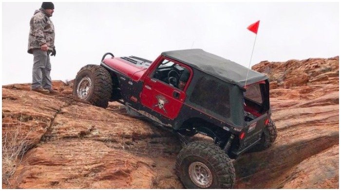 Chuck mengendarai Jeep ini saat menaiki tebing-tebing di Sand Hollow State Park, Utah, Amerika Serikat dan akhirnya dapat tiba dengan selamat di atas.