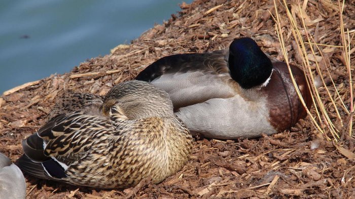 Bebek liar tidur secara berkelompok, dengan bebek yang tidur di posisi paling pinggir membuka satu matanya untuk waspada terhadap predator.