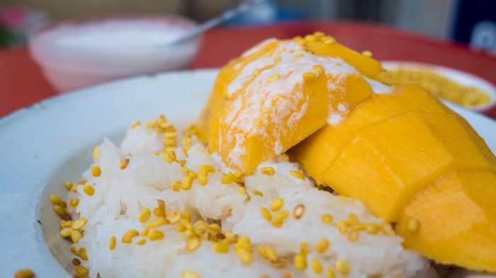 Mango sticky rice ini sebutan untuk jajan pasar Thailand yang terbuat dari ketan gurih bertabur wijen dengan saus santan kental dan potongan mangga segar sebagai pelengkap.