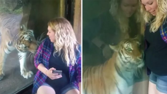 Saat Natasha mencoba bangun dan mendekatkan perutnya di dinding kaca, harimau itu tampak mengeluskan kepalanya.
