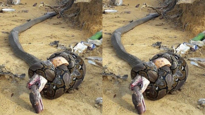 TRIBUNTRAVEL.COM - Bagaimana jadinya jika ular kobra bertarung dengan piton raksasa?