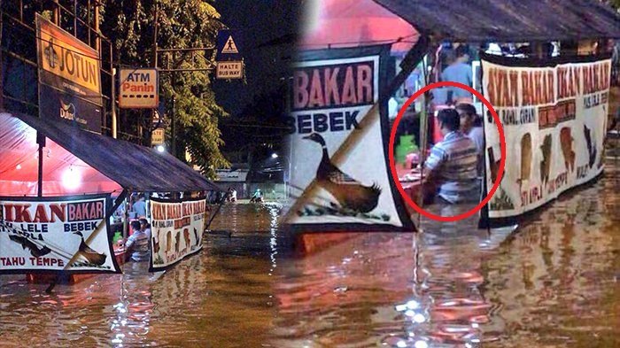 TRIBUNTRAVEL.COM - Pecel lele ini tetap buka, meski banjir menggenang hampir satu meter.