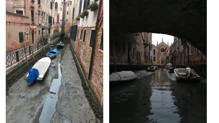 Berikut beberapa foto yang berhasil diabadikan saat sungai di Venesia sedang surut (diambil pada 31 Januari dan 1 Februari 2018) yang dirangkum dari laman Facebook Colombina Hotel Venice.