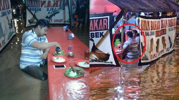 Meski tengah dikepung banjir yang hampir merendam sebagian tubuhnya, pria tersebut tetap santai menyantap hidangannya.