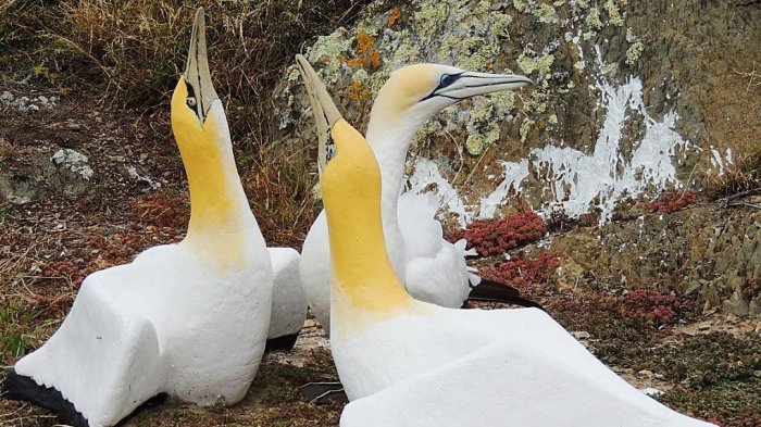 Chris mengatakan, setelah Nigel tiba di Pulau Mana lima tahun yang lalu, dia mulai merayu dan mendekati satu dari 80 replika beton burung gannet yang ditempatkan di tebing timur.