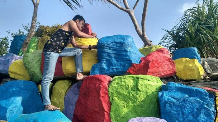 Dalam postingan pertama itu terlihat beberapa orang sedang mewarnai bebatuan pinggir pantai dengan cat warna-warni.