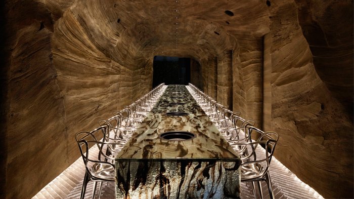 Lantai pertama terdapat meja panjang dengan suasana menyerupai gua yang terinspirasi dari Antelope Canyon di Arizona.