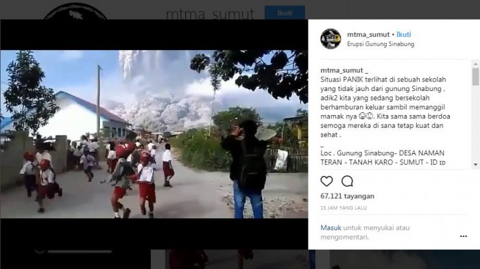 "Situasi PANIK terlihat di sebuah sekolah yang tidak jauh dari gunung Sinabung, adik-adik kita yang sedang bersekolah berhamburan keluar sambil memanggil mamaknya (emoticon). Kita sama-sama berdoa semoga mereka di sana tetap kuat dan sehat," tulis akun Instagram @mtma_sumut.